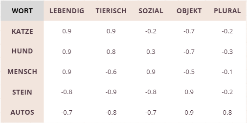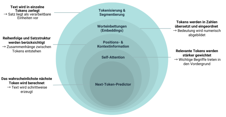 Jedes Token wird in einen numerischen Vektor, also eine numerische Repräsentation, überführt (sogenanntes Embedding). Diese Vektoren bilden keinen festen Wortwert ab, sondern eine Bedeutungsposition im Sprachraum. Wörter mit ähnlicher Bedeutung oder Nutzung liegen im Vektorraum nahe beieinander.