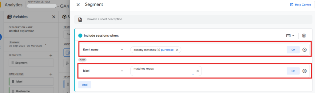 Für diese Fragestellung wurde in GA4 Explore ein individueller Report aufgebaut. Die Grundlage war ein Session Segment, das zwei Bedingungen kombiniert: