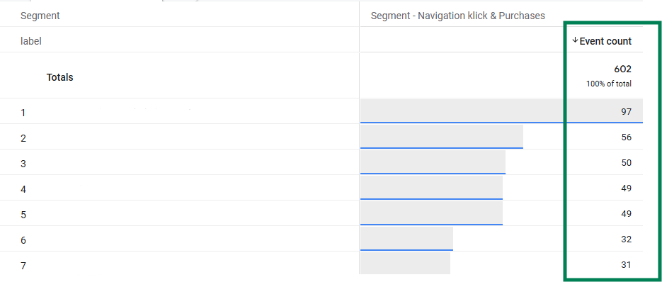 In einer aktuellen Auswertung ging es darum, die ungefähre Anzahl an Käufen auf einer Website zu analysieren, wenn Nutzer innerhalb derselben Session zuvor bestimmte Elemente in der Navigationsleiste angeklickt haben. Ziel war also nicht die exakte Attribution eines Kaufs auf ein einzelnes Element, sondern ein besseres Verständnis dafür, welche Navigationsbereiche in kaufnahen Sessions besonders häufig vorkommen.